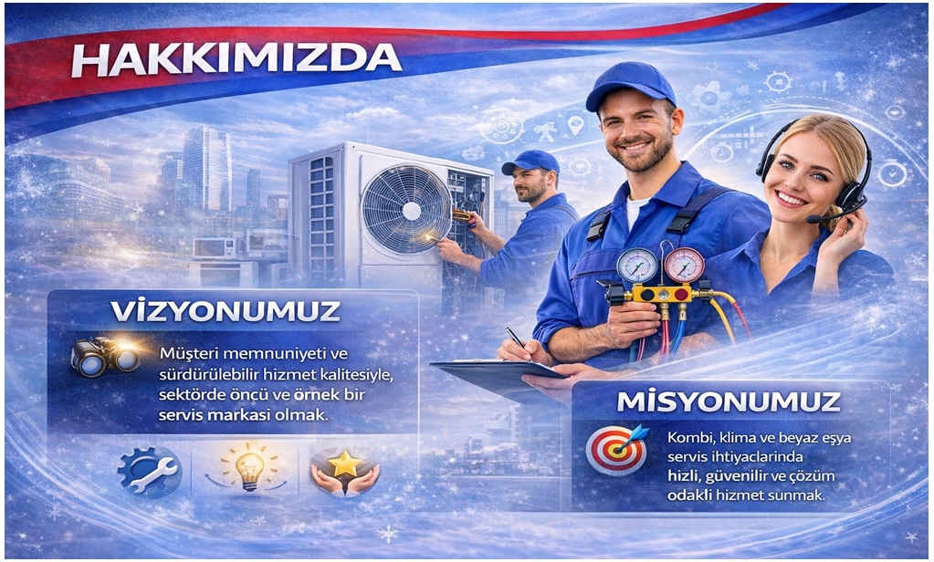 Her geçen gün büyüyen hizmet ağımız ve uzman teknik ekibimizle, servis kalitesini sürekli yükseltmeyi hedefleriz. Şeffaf hizmet politikamız, planlı çalışma sistemimiz ve güçlü iletişim altyapımız sayesinde, servis sektöründe güvenin simgesi haline gelmeyi amaçlıyoruz. Vizyonumuz, müşteri memnuniyetini merkezine alan, çevreye ve enerji verimliliğine duyarlı, çağdaş ve kurumsal bir servis markası olarak sektörde öncü konumda yer almaktır.